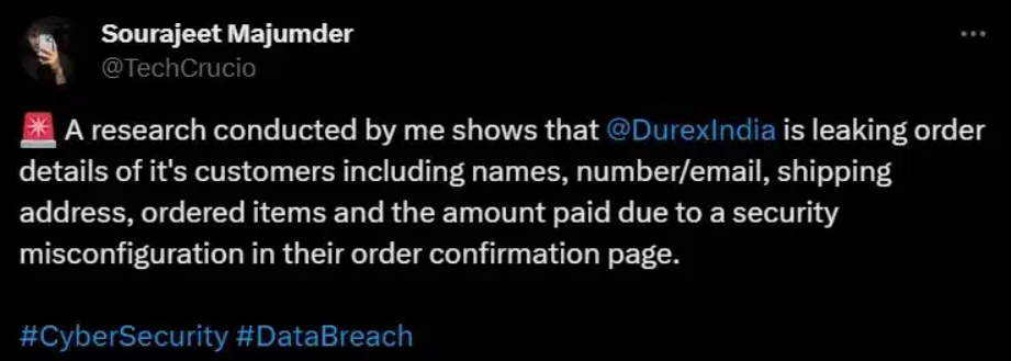 ආරක්ෂක පරීක්ෂකයෙකු වන Sourajeet Majumder විසින් මෙම දත්ත පිටවීමේ ගැටළුව සොයාගත් අතර, Durex India හි වෙබ් අඩවියේ ඇණවුම් පිටුවේ නිසි සත්යාපන ක්රියාවලියක් නොමැති බවත් පාරිභෝගික දත්තවෙත අනවසරයෙන් ප්රවේශ වීමට ඉඩලබාදෙන බව ඔහු සොයාගත්තේය. මෙලෙස බලපෑමට ලක්වූ ගනුදෙනුකරුවන්ගේ නිශ්චිත සංඛ්යාව නොදන්න නමුත්, සිය ගණනකගේ දත්ත පිටවී ඇතැයි අනුමාන කලහැකිය.