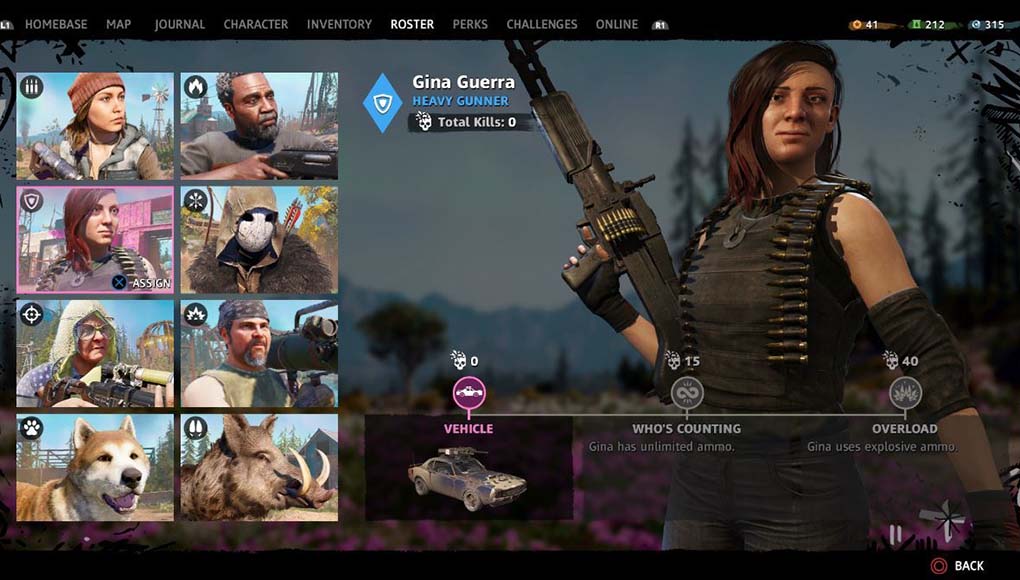 - Far Cry 5 ලෙසටම Far Cry New Dawn හීද සුපුරුදු menus වන perk menu, map, journal, roster වැනි menus දක්නට ලැබේ. මීට අමතරව homebase නම් නව section එකක් දක්නට ලැබෙන අතර එමගින් අපට prosperity settlement එක විවිධ වැදගත් buildings construct කිරීම මගින් customize කළහැක.