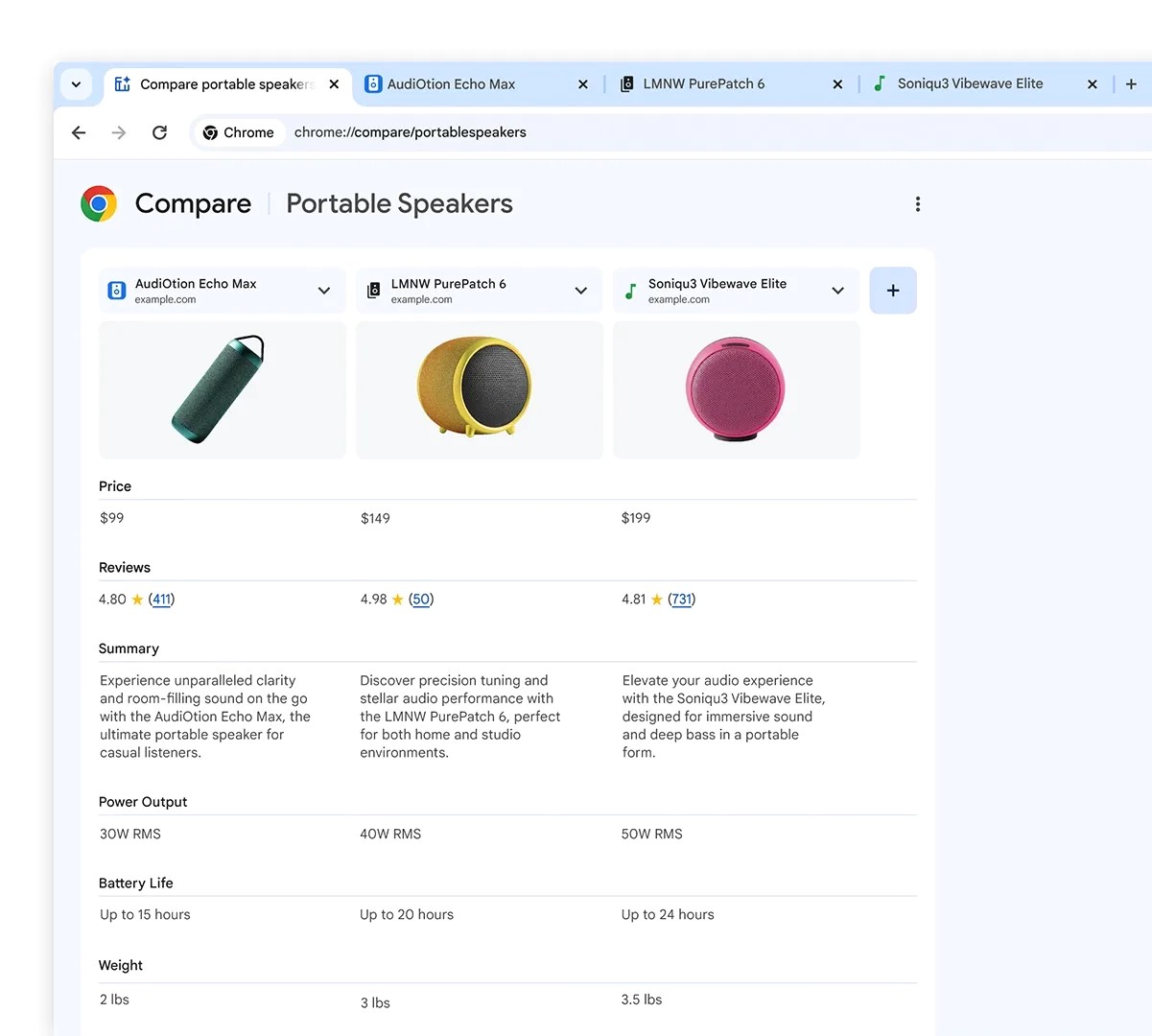 ඊලග feature එක තමයි tab compare for shopping assistance කියන feature එක. ඉදිරියේදී ඔබ විවිධ tabs හරහා සොයන සමාන items සදහා AI බලයෙන් ක්රියාත්මක වන සාරාංශයක් Chrome විසින් ලබාදෙනවා කියලා තමයි සදහන් වෙන්නෙ. උදාහරණයක් විදිහට, අලුත් Bluetooth speaker එකක් සොයනවා නම්, ඔබ විවිධ pages හරහා මෙම විස්තර දෙස බලන විට product specs, features, මිල ගනන් සහ ratings වැනි විස්තර එක තැනක පෙන්වනවා කියල තමයි වැඩි දුරටත් සදහන් වෙන්නේ.