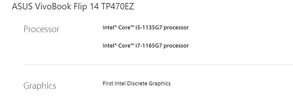 Asus සමාගමේ තවමත් නිකුත් වී නොමැති Asus Vivobook Flip 14 Product page එකේ තොරතුරු තුල intel සමාගමේ අළුත්ම Discrete Graphics ගැන තොරතුරු අඩංගු වෙන බව පෙනී යනව. මෙම නව Vivobook Flip 14හි තොරතුරු අනුව intel core i7 සමග පළමු intel Discrete Graphics අඩංගු බව සදහන් වන අතර එහි Specifications page එකේදීද මෙය “Fisrt intel Discrete Graphics” ලෙස සදහන් කර තිබෙනව.