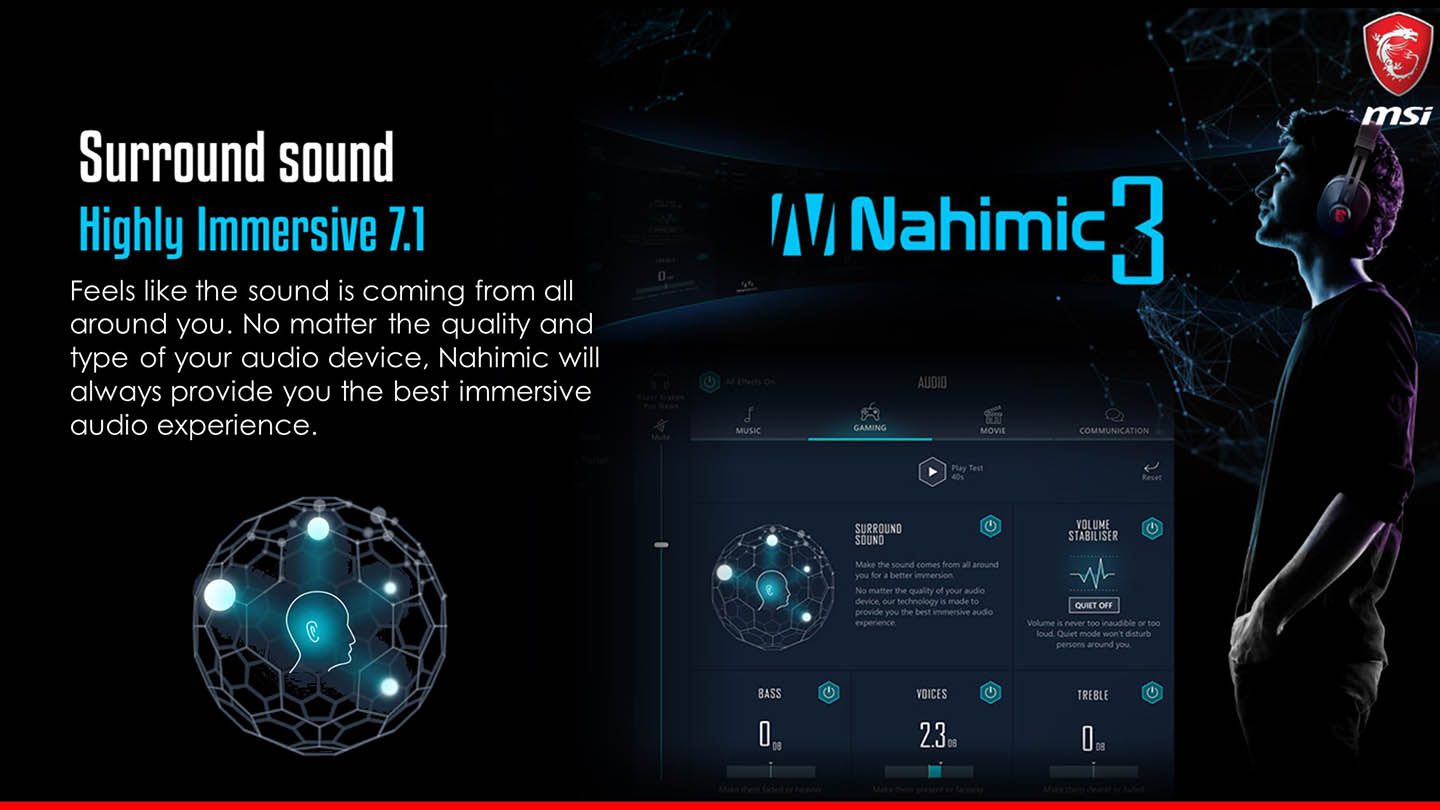 Nahimic Surround Sound – MSI Laptop වල ඇති Surround Sound තාක්ෂණය ලබාගෙන ඇත්තෙ ප්රංශයේ Nahimic ආයතනය වෙතිනුයි. මුල් කාලයේ යුධ තාක්ෂණික සහ ගුවන් නියමුවන් සදහා ශබ්ධ පද්ධති සකස් කල Nahimic සමාගම මේ වන විට Consumer Electronic සදහා තම නිෂ්පාදන ලබාදෙනව.