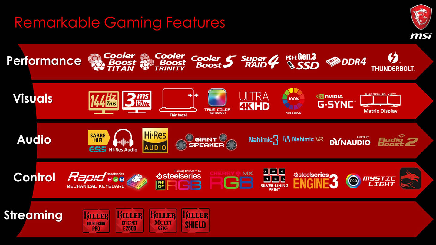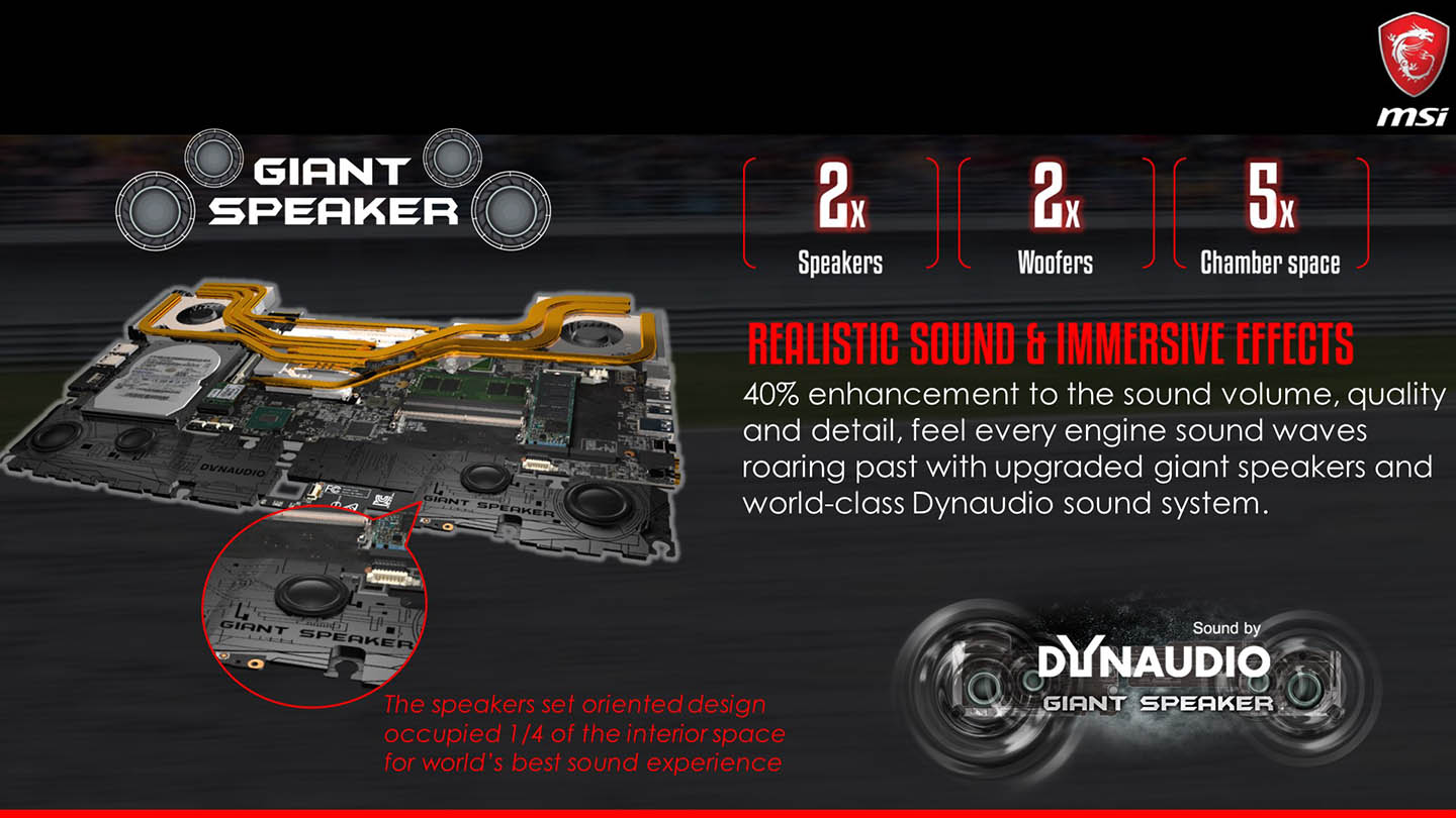 Audio – MSI නිෂ්පාදන වල අඩංගු Audio සදහා අති විශේෂ අවධානයක් යොමුකර තිබෙනව. Giant Speaker යටතේ ශබ්දය ප්රතිනිර්මාණය කිරීමට විශාල Speakers සහ ඒවාට අවශ්ය තාක්ෂණය Bugati, Audi වැනි Sports Car සදහා Audio නිපදවන DynaAudio සමාගමෙන් ලබාගන්න MSI සමාගම කටයුතු කර තිබෙනව.