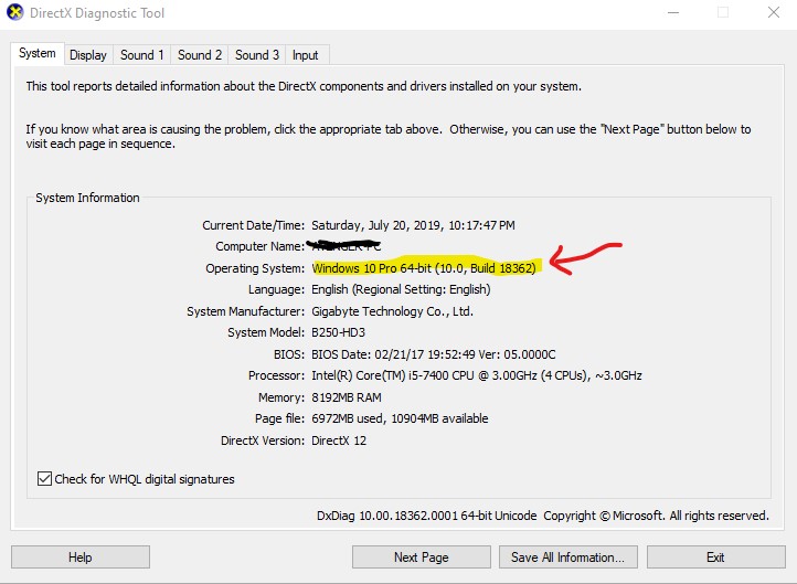 මෙහිදී Windows Key+ R හරහා RUN විධානය ලබාගෙන එහි DXDIAG ලෙස Type කර පහත ආකාරයට DirectX Diagnostic tool එක ලබාගෙන ඔබගේ Windows සංස්කරණය සහ නවතම Update එක හරහා Version එක update වී ඇතිදැයි පරික්ෂා කරගන්න.