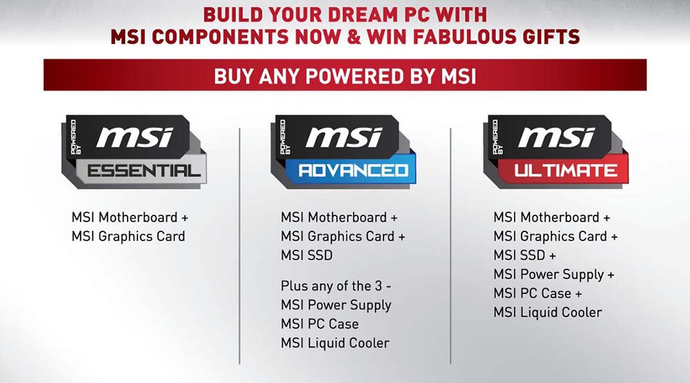 | MSI ADVANCED | MSI Motherboard MSI Graphics Card MSI SSD ———– any of the following MSI Power Supply MSI PC Case MSI LIquid Cooler  | MSI True Gaming Umbrella![]()  |