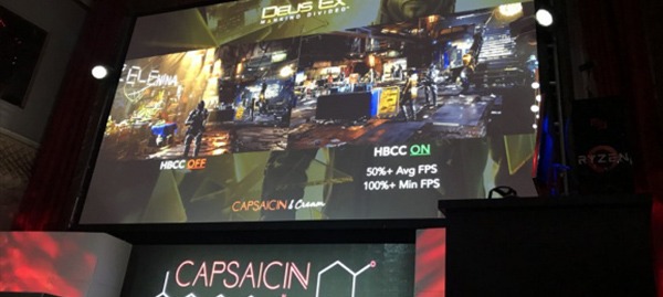 Event එකේදි AMD Ryzen system එකක 2GB VEGA GPU එකක් හයි කරල Deus Ex: Mankind Divided play කරල පෙන්නුව. HBCC on කරාම Average FPS 50%ක් වැඩි උනා වගේම minimum FPS එක 100% කින් වැඩි උනා. AMD සමාගම කිව්වෙ මේ HBCC තාක්ෂණය එක්ක එයාලට මිලෙන් අඩු high performance GPU හදන්න පුලුවන් කියල. මොකද GPU RAM එක අවශ්ය වෙලාවට System memory වලින් වැඩි කරගන්න පුලුවන් නිසා AMD VEGA Graphics Card වලට 2GB වගේ memory එකක් හොදටම සෑහෙන නිසයි.