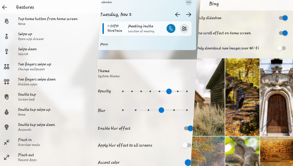 Microsoft Copilot වැනි AI විශේෂාංග, Image searching ඇතුළුව, Bing Daily Wallpapers, Bing News, කාලගුණය සහ ඔබේ Android දුරකථනය ඔබේ Windows පරිගණකයේ ඇති Sticky notes, To-Do, Calendar, OneDrive වැනි යෙදුම් sync කිරීමට ද මෙම යෙදුම භාවිතා කළ හැක. Microsoft Launcher මඟින් ඔබගේ කාලය ඉතුරු කරගෙන වැඩ පහසු කර ගැනීමට මෙන්ම යෙදුම් භාවිත කරන කාලය, තිරය ක්රියාත්මකව පවතින කාලය, යෙදුම් සැඟවීම, Icon Customize කිරීම සහ විවිධ ක්රියාකාරකම් සඳහා gestures එකතු කිරීම වැනි විශේෂාංග වලින් සමන්විත වීම හා ඔබේ දුරකථනයට අලුත් මුහුණුවරක් එක් කිරීමට ද මෙම යෙදවුම සමත් වේ.