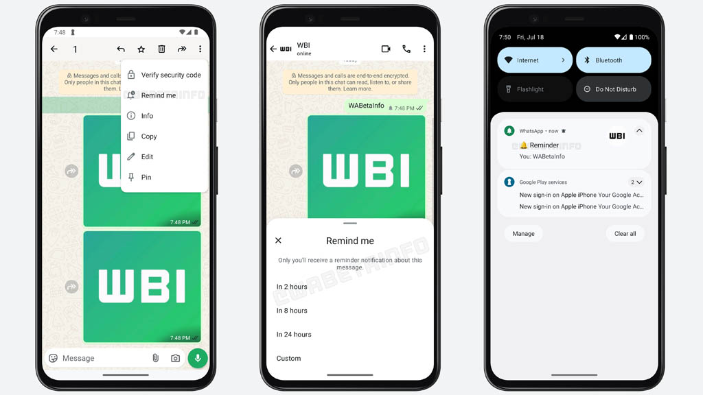 මේ කියන්නේ, ඔයාට ලැබෙන message එකක් පසුව reply කරන්න කියලා හිතෙන විට යොදාගන්න පුලුවන්, ඒකට reminder එකක් set කරගන්න system එකක්. මෙතෙක් WhatsApp එකේ message එකක් mark කරගන්න “star” එකක් තිබුණත්, ඒක direct notification එකක් මගින් ලබාදුන්නෙ නැහැ. නව feature එකෙන්, message එකක් long-press කරාම “Remind me” කියන option එකක් දැන් දැක්වෙනවා.