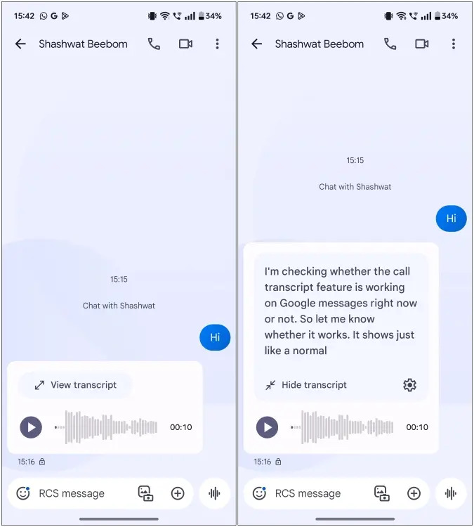 පහතින් දැක්වෙන්නෙ Google Messages ඇප් එකෙ වොයිස් transcriptions පෙන්වන ආකාරයයි.
